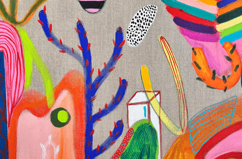 Pinta para recordar: “Pinto para no olvidar”. A través de su arte, recupera fragmentos de su infancia—recuerdos de cruzar fronteras, del movimiento constante, de desprenderse de pieles. Su proceso creativo tiene raíces en el recuerdo: pintar se convierte en una forma de mantener vivas las memorias y dar forma a lo que no se puede expresar con palabras.