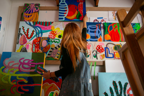 Formas orgánicas, paletas de colores vibrantes y texturas en capas evocan las sensaciones de movimiento, transformación y renacimiento. Sus obras a menudo hablan sobre lo que significa renacer en lugares desconocidos o incluso hostiles, llevando dentro de ella los ecos de cada lugar que ha llamado hogar.